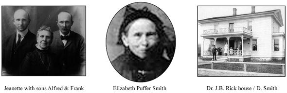 Recent research has produced more interesting information and photos of the Daniel Smith family. In this issue, we will share them with you. Our previous article featured photos of what we believe to be the Daniel Smith house. Below right is one recently obtained, taken around 1895. Dr. J.B. Rick purchased the house from the Smith Family around 1890 and started his medical practice in the home. Dr. Rick and his daughters, Ruth and Elsi (1884-1964), are on the front porch. This is the earliest picture that we have of the house, which originally was along the river near the present-day barber shop.