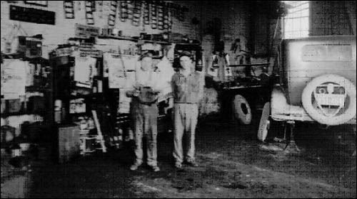 With the coming of the automobile, one of the first auto repair businesses in Mishicot was started in the early 1920s by William (Bill) Meineke (on left in photograph). His first garage was located on Main Street, close to the river behind the old grain mill (now the Country Store). Bill and his wife, Mayme (Redeker), raised two sons, Donald and Dale. While the boys were overseas in the Second World War, Bill wrote to them, asking if they would join him in business when they returned. If so, he would build a new building next to their home. "Meineke and Sons Garage" was built at 137 West Main Street, now the site of Mishicot Auto Sales, where the three operated the business together. Thus, Meineke's garage, operated in two locations on Main Street, was active for a total of sixty years. During those years, Bill and his sons also served as Mishicot Volunteer Firemen; Dale was Assistant Fire Chief for 30 years.