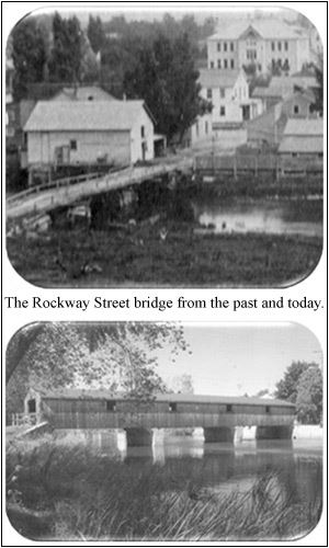 The first Main Street and Rockway Street bridges were made of logs placed across piles of stones that were held in place by frames of logs. Main Street was originally called Water Street because it paralleled the river. Rockway Street was named by Daniel Smith for his first grandson, Rockway. Rockway Smith was the son of Daniel's oldest son, Alfred, who helped him build the mills in town.