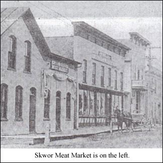Skwor's Meat Market, 326 East Main Street in Mishicot, dates back to 1879 when Adolph Grim deeded the building to Louis Levenhagen. This was the original meat market, appearing much the same as it is now, more than a century later. In 1894, Levenhagen deeded the market to Joseph Skwor. Joseph and his wife, Rose, working together, built the business. Rose helped where needed. A petite but strong woman, she could carry a quarter of beef on her shoulder to where it would be trimmed into special cuts of meat. Joseph and Rose continued in business until their two sons, Charles and Hugo, joined the business. It then became known as Jos. Skwor and Sons Meats.